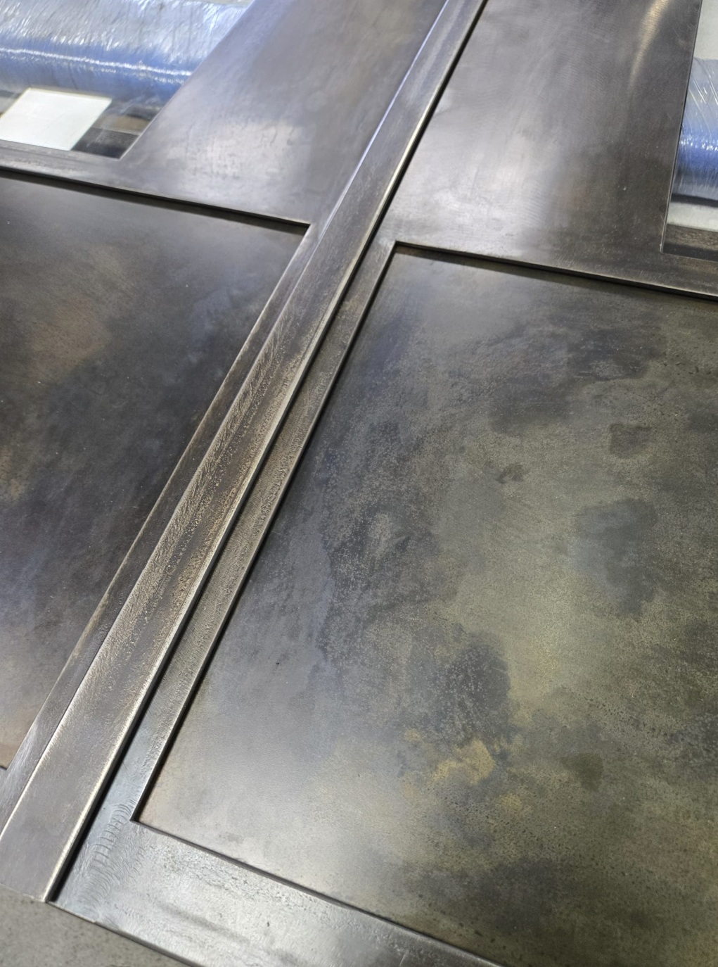 Stahlrahmen in Messingoptik werden in der Regel durch spezielle Veredelungssysteme erreicht und nicht durch die Verwendung von massivem Messing. Das Ziel ist es, die visuelle Komplexität von gealtertem Metall nachzubilden: sanfte Tonvariationen, dunklere Ränder und eine patinierte Tiefe, die aus normaler Betrachtungsdistanz authentisch wirkt.